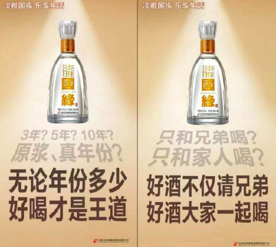 “3年?5年?10年?原浆、真年份?无论年份多少,好喝才是王道”“只和兄弟喝?只和家人喝?好酒不仅请兄弟,好酒大家一起喝”。近日,今世缘旗下淡雅国缘的两张海报引发了不小的争议,业内普遍认为,这是在阴阳拉踩竞争对手洋河。