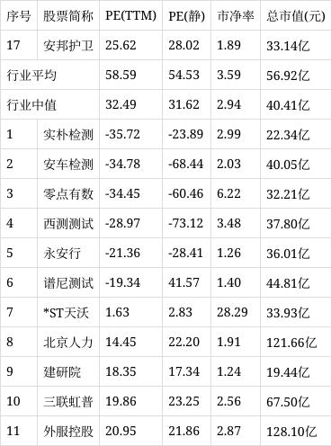 从行业市盈率排名来看,公司所处的专业服务行业市盈率平均58.59倍,行业中值32.49倍,安邦护卫排名第17位。
