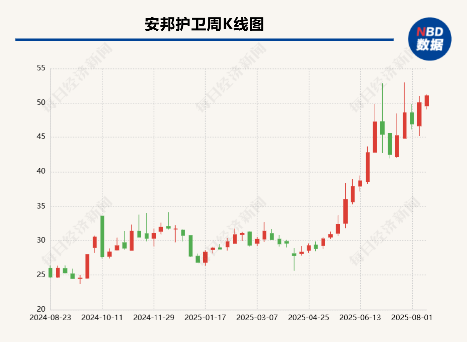 安邦护卫IPO的发行价格为19.1元/股,公司上市以来股价长时间呈震荡下行的趋势。今年4月初触底后,安邦护卫股价开始强势反弹,4月9日~8月11日,公司股价累计涨幅近90%。截至2025年8月11日收盘,公司股价为51.07元/股。
