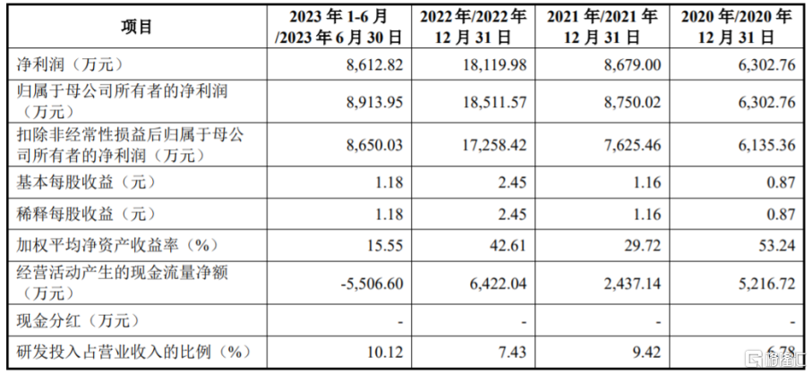 业绩方面,2020年至2023年1-6月,盛景微实现营业收入约2.11亿元、3.56亿元、7.71亿元、3.82亿元,净利润分别约0.63亿元、0.87亿元、1.81亿元、0.86亿元。