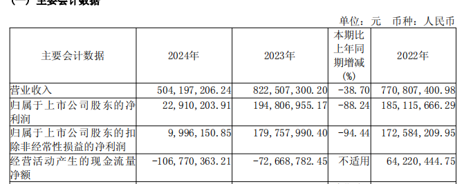 2024年,公司实现归属于上市公司股东的净利润2291.02万元,同比减少88.24%;实现归属于上市公司股东的扣除非经常性损益的净利润999.62万元,同比减少94.44%。