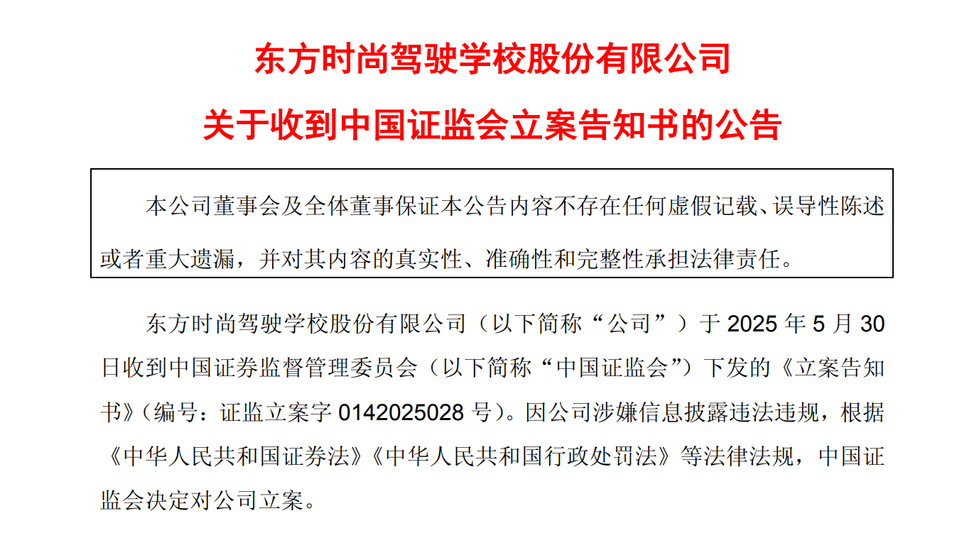 5月30日晚,ST东时(东方时尚)发布公告称,收到中国证监会下发的《立案告知书》,因涉嫌信息披露违法违规,证监会决定对其立案调查。这家曾经的“驾校第一股”在18个月内第二次遭监管立案。