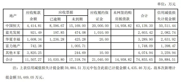 而信用计提减值损失的原因,则是公司房地产客户恒大系企业(以下简称“中国恒大”)、华夏幸福系企业(以下简称“华夏幸福”)、蓝光系企业(以下简称“蓝光发展”)、富力系企业(以下简称“富力地产”)等,出现信用风险扩大现象,亚士创能对截至2021年12月31日公司合并报表范围内对该些客户的应收账款、应收票据、其他应收款等债权进行信用减值损失单项计提。其中,对中国恒大信用减值损失计提占了“大头”,金额达到50,511.44万元,占合计信用减值损失计提金额的84%。