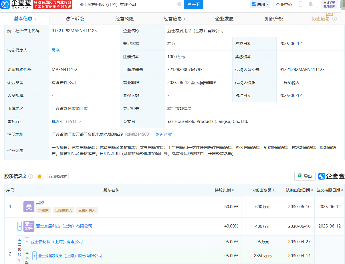 近日,亚士家居用品(江苏)有限公司成立,法定代表人为吴涤,注册资本为1000万元,经营范围包含:家居用品销售;体育用品及器材批发;文具用品零售;卫生用品和一次性使用医疗用品销售;办公用品销售;针纺织品销售;软木制品销售等。股权穿透显示,该公司由吴涤、亚士创能(603378)旗下亚士家居科技(上海)有限公司共同持股。