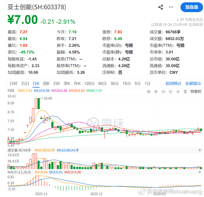 二级市场对公司风险已有所反应,截至1月26日收盘,亚士创能股价下跌2.91%,报收7元/股,总市值缩水至30亿元。尽管近一年来公司股价累计上涨约12%,但相较于2020年的阶段性高点,股价累计跌幅已超88%,投资者信心受到严重冲击。某券商建材行业分析师在接受采访时表示,亚士创能当前面临的核心问题是“股权风险与经营困境的双向传导”,短期需关注被动减持及诉讼进展对股价的影响,长期则取决于公司能否在行业存量竞争中找到转型路径,摆脱对房地产新建项目的依赖。