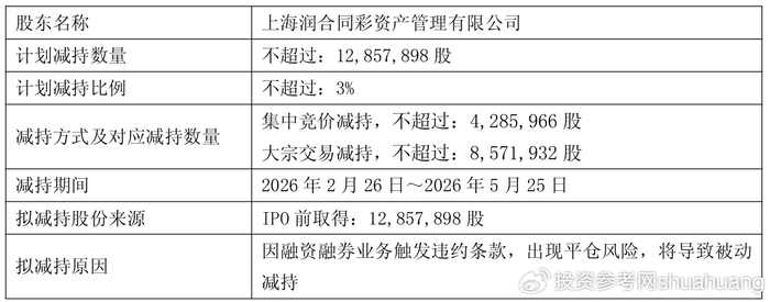 公告显示,亚士创能控股股东的一致行动人润合同彩,因参与融资融券业务发生债务违约,触发了券商强制平仓程序,本次可能被强制平仓减持的股份数量为1285.79万股,占公司总股本的3%。减持实施周期定于2026年2月26日至5月25日,减持价格将按照实施时的市场价格确定,公司同时强调,本次被动减持事项不会导致控股股东及实际控制人发生变更,控制权保持稳定。