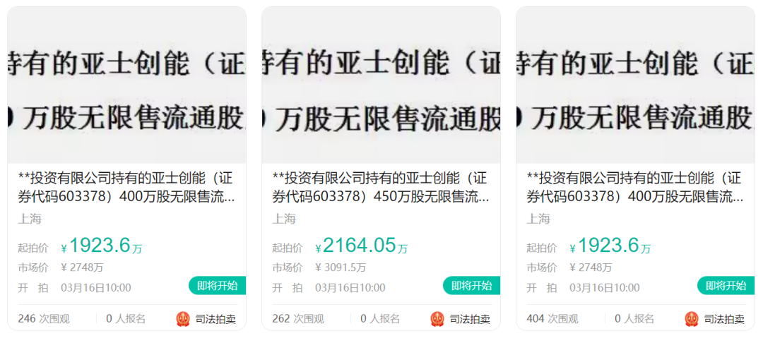 截至目前,创能明持有亚士创能股份78,655,500股,占公司总股本的18.35%。亚士创能称,此次拍卖事项不会影响公司的生产经营,也不会导致公司股权分布不具备上市条件。