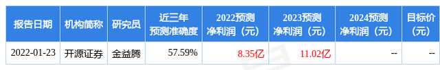 证券之星数据中心根据近三年发布的研报数据计算,开源证券金益腾研究员团队对该股研究较为深入,近三年预测准确度均值为57.59%,其预测2022年度归属净利润为盈利8.35亿,根据现价换算的预测PE为13.39。