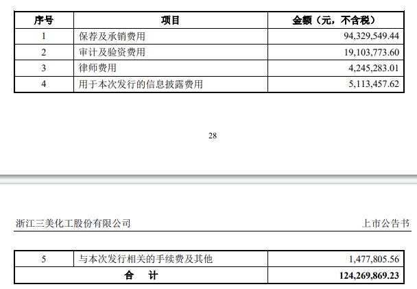 三美股份公开发行新股的发行费用不含税金额合计124,269,869.23元,其中保荐及承销费用94,329,549.44元。