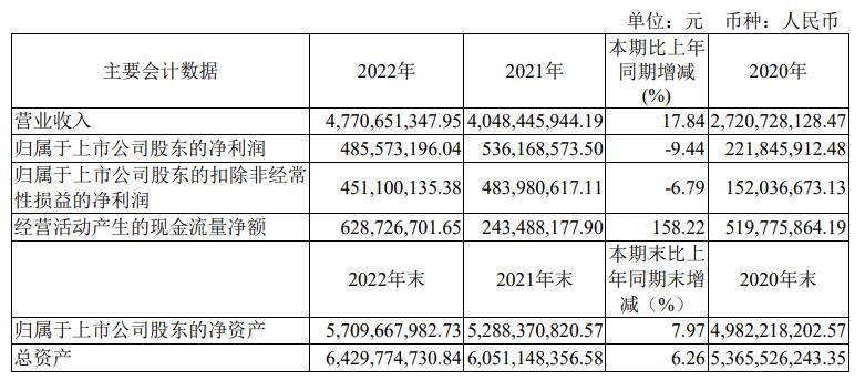 2022年,三美股份实现营业收入4,770,651,347.95元,同比增长17.84%;归属于上市公司股东的净利润 485,573,196.04元,同比减少9.44%;归属于上市公司股东的扣除非经常性损益的净利润 451,100,135.38元,同比减少6.79%;经营活动产生的现金流量净额 628,726,701.65元,同比增长158.22%。