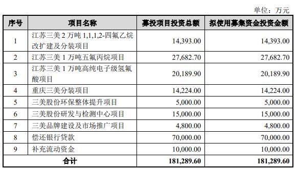 2019年3月20日,三美股份发布的首次公开发行股票招股说明书显示,公司拟募集资金181,289.60万元,用于江苏三美2万吨1,1,1,2-四氟乙烷改扩建及分装项目、江苏三美1万吨五氟丙烷项目、江苏三美1万吨高纯电子级氢氟酸项目、重庆三美分装项目、三美股份环保整体提升项目、三美股份研发与检测中心项目、三美品牌建设及市场推广项目、偿还银行贷款、补充流动资金。