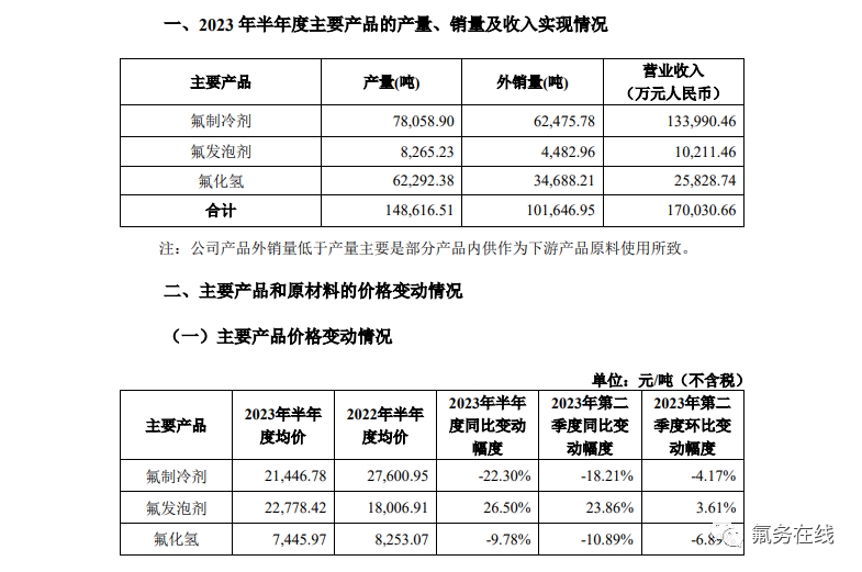 具体情况如下:据公告显示,公司根据产品市场情况,及时调整生产、销售策略,保证生产经营的稳定。由于HFCs配额基线年已经结束,HFC-32、HFC-134a价格回归理性,不再亏本出售。2023年1-6月,硫酸、氯化物等原材料价格下滑,对氟制冷剂价格支撑力度减弱。市场上制冷剂高位库存量、公司2022年底高价原材料库存等不利因素已在一季度基本消除,加之制冷剂下游备货旺季来临,二季度产品盈利情况得以改善。报告期内,氟制冷剂销售均价、销量均同比下降。