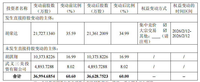 胡荣达于2026年2月12日通过集中竞价交易及大宗交易方式累计减持公司股份3,659,331股,占公司总股本的0.60%。本次减持后,胡荣达及其一致行动人合计持有公司股份的比例由60.60%减少至60.00%,权益变动触及5%刻度。