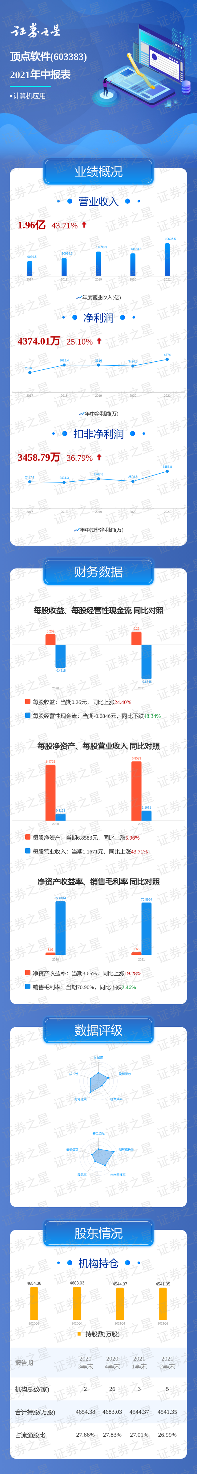 证券之星数据中心讯,顶点软件2021中报显示,公司主营收入1.96亿元,同比上升43.71%;归母净利润4374.01万元,同比上升25.09%;扣非净利润3458.79万元,同比上升36.79%;负债率14.76%,投资收益616.5万元,财务费用-621.16万元,毛利率70.9%。