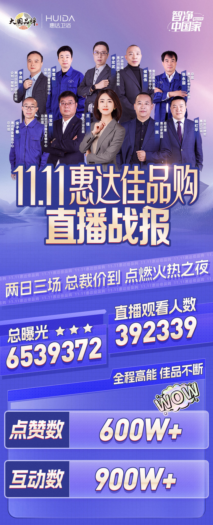 惠达卫浴总裁王佳曾多次现身直播,并取得不错的成绩。例如在“双11总裁价到,惠达佳品购”直播活动中,抖音平台总曝光超653w,直播观看人数近40w观看量,超600w点赞,900w+次互动。