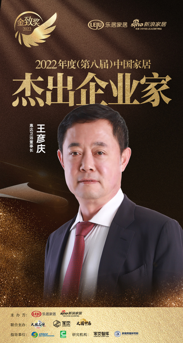 新浪家居讯由乐居家居主办,新浪家居承办,大国品牌、家页智库、大国中居联合主办的『趁势·再起——2022中国家居新时代盛典暨金致奖颁奖典礼』于12月26日在云端盛大开幕。惠达卫浴董事长王彦庆荣获「2022年度(第八届)中国家居杰出企业家」称号。