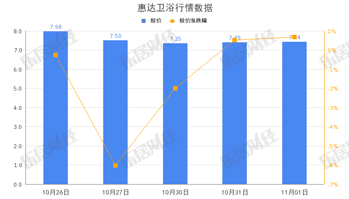 截至11月01日,惠达卫浴(603385.SH)股价收盘报7.39元,涨0.68%,总市值28.40亿元。