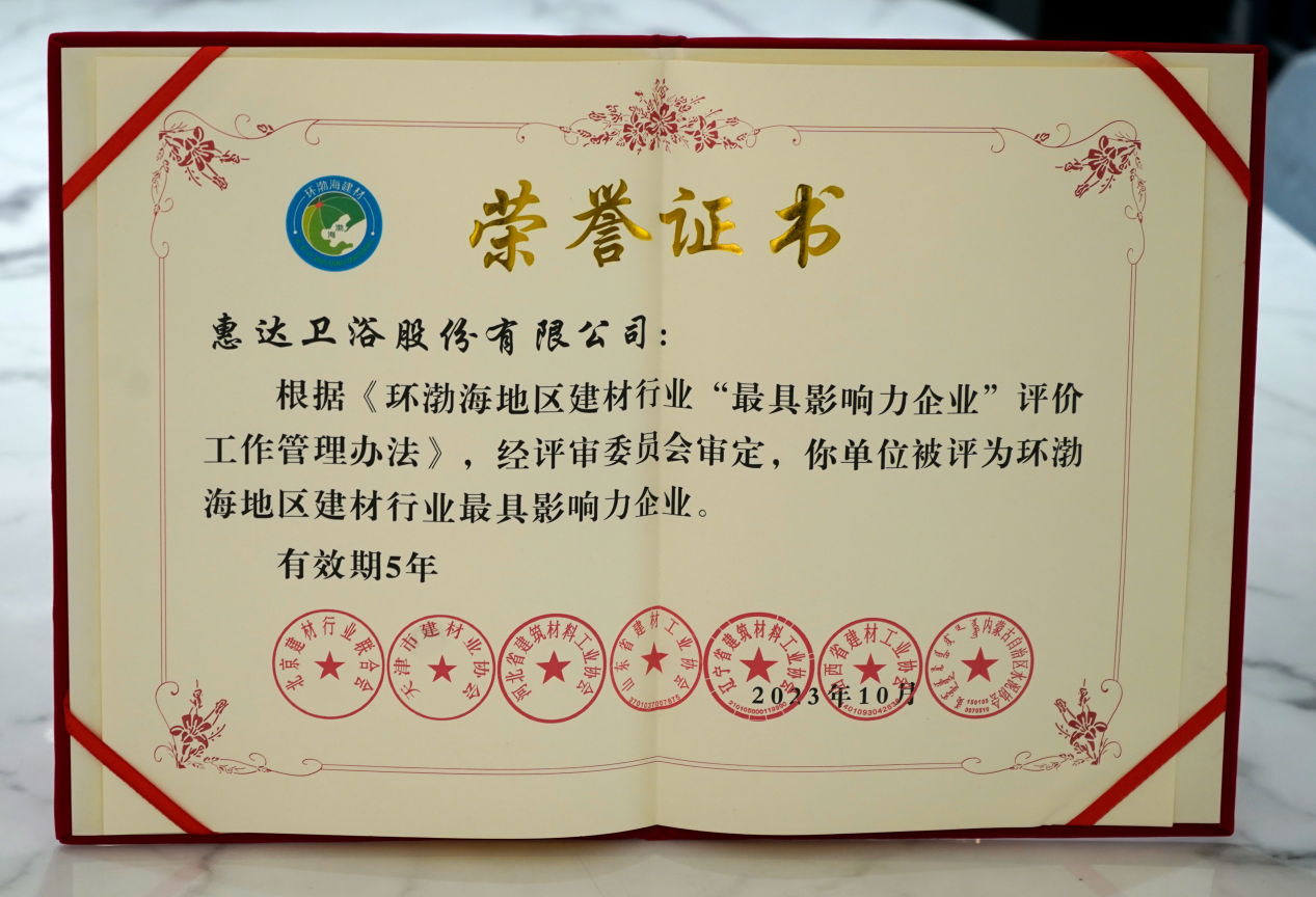 图:惠达卫浴荣获2023年度环渤海地区建材行业最具影响力企业