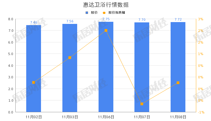 截至11月08日,惠达卫浴(603385.SH)股价收盘报7.70元,涨0.26%,总市值29.47亿元。
