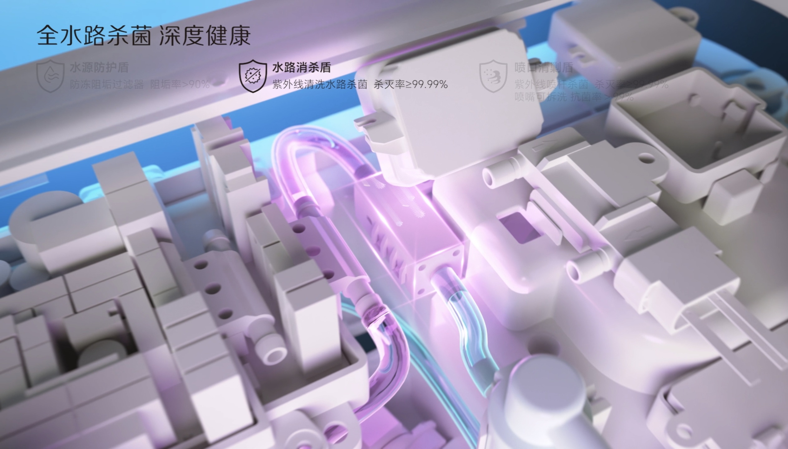 动态灭菌防护:区别于传统的静态或局部杀菌技术,“全水路杀菌”系统能够在水流实时通过时进行高效、持续的灭菌处理,确保每一次用水都是洁净健康的活水。