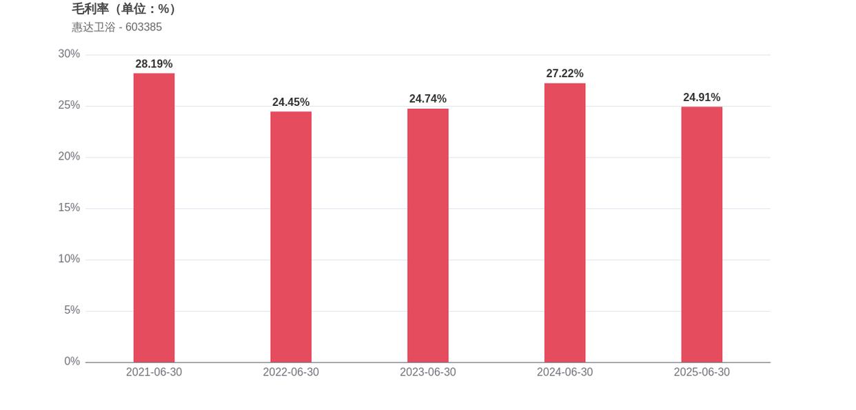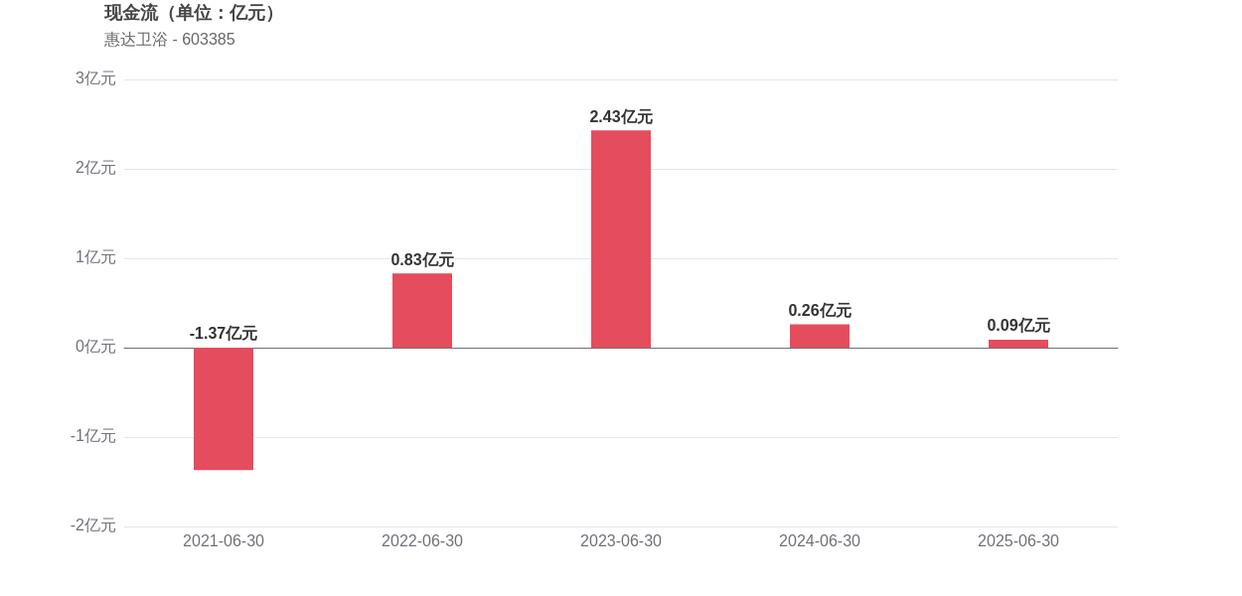 在经营稳健性方面,惠达卫浴面临存货周转效率放缓的挑战,存货周转天数增至160.31天,表明公司库存管理压力加大。经营活动产生的现金流净额为0.09亿元,同比下滑65.38%,显示出公司现金创造能力的减弱。此外,2025年上半年的资产负债率为25.65%,同比下降5.37个百分点,这意味着公司负债水平有所改善。