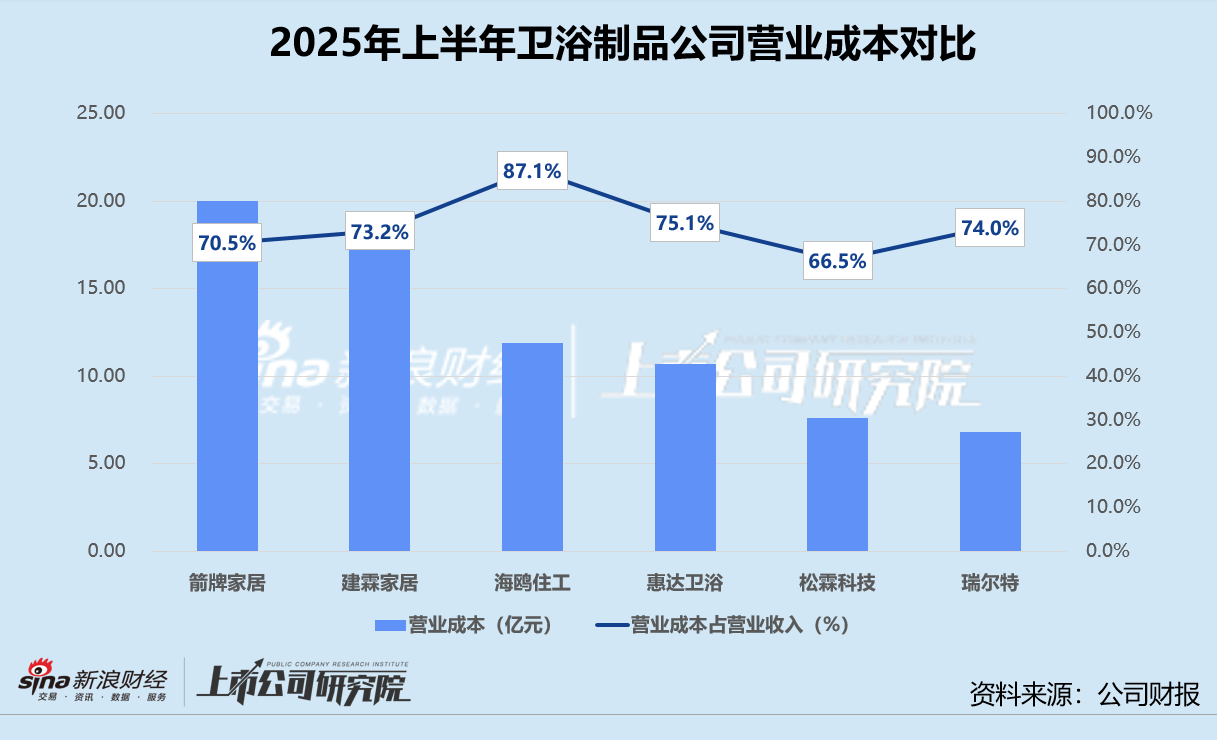 就成本控制而言,卫浴制品公司上半年的营业成本随着业务收缩普遍走低,箭牌家居和建霖家居的成本同比下降幅度高于当期收入降幅。箭牌家居同样以20.01亿元成本位列第一,约为第二名建霖家居的1.15倍。瑞尔特营业成本同比下降16.0%至6.81亿元,处于末位,其中水箱及配件、智能坐便器及盖板分别较2024年上半年减少17.0%、20.0%。