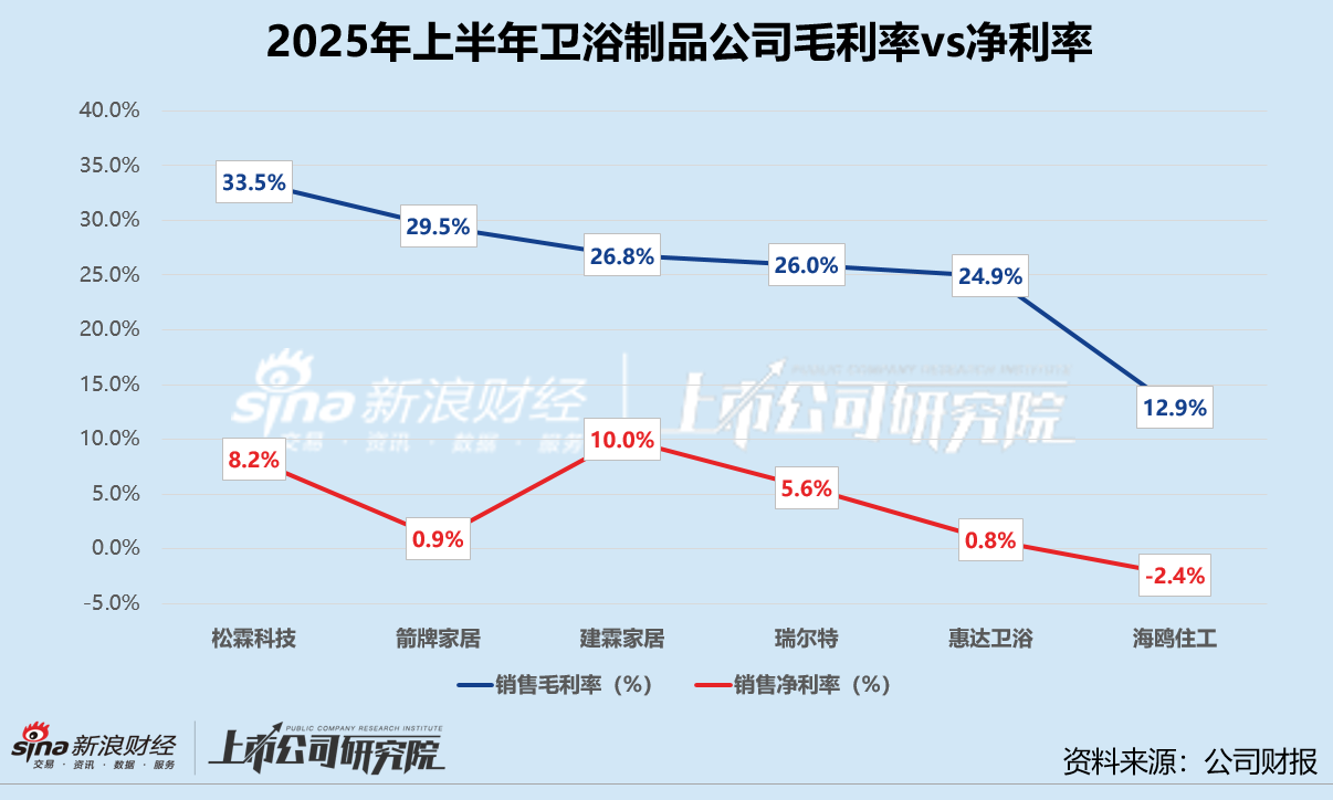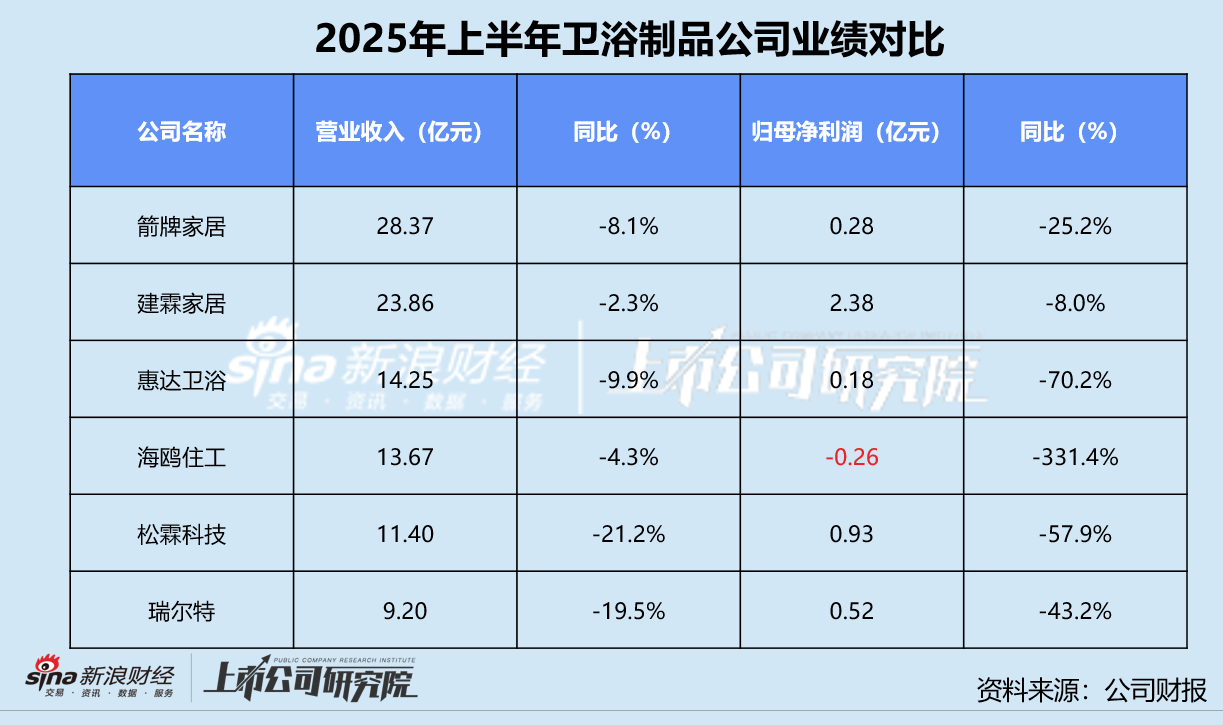 就收入规模而言,箭牌家居以28.37亿元居于榜首,比第二名建霖家居上半年营收约高出4.51亿元。瑞尔特前6个月实现9.20亿元营收排在最后,与2024年上半年相比显著下降19.5%。业绩公告显示,公司主营智能坐便器产品生产销售,报告期内境内收入同比下滑27.8%,拖累业绩表现。境内业务不及预期的还有松霖科技,其境内收入较2024年同期减少33.5%,导致整体营收下降21.2%。