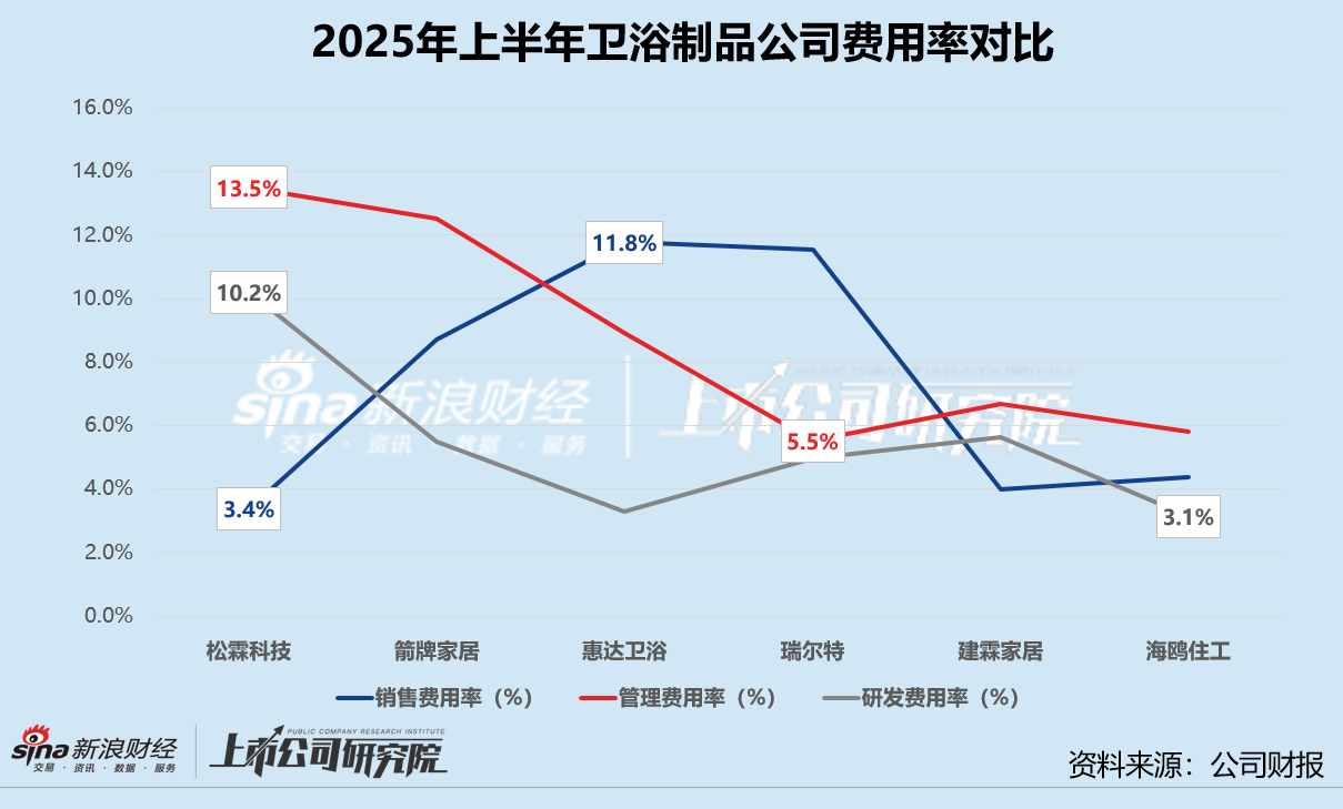 综合作用之下,松霖科技的销售毛利率即使同比微降1.8个百分点至33.5%,依旧跑赢同行。海鸥住工毛利率掉队,较2024年上半年减少3.6%至12.9%。此外,瑞尔特和惠达卫浴毛利率也同比呈下行趋势。建霖家居销售净利率稳居首位,虽然与2024年同期相比微降0.6个百分点,但仍比第二名松霖科技约高1.9个百分点。海鸥住工销售净利率以-2.4%,排名倒数第一。值得关注的是,松霖科技毛利率在6家公司中最高,净利率却从2024年上半年的15.3%骤降至2025年上半年的8.2%,管理费用和研发费用走高一定程度侵蚀了利润空间。
