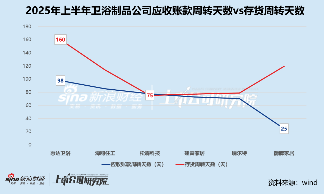 惠达卫浴应收账款和存货周转天数双高,分别为98天、160天。业绩公告显示,惠达卫浴的应收账款主要来源于战略性地产业务,上游房企经营疲软对其造成不利影响,账龄在3年及以上的应收账款约占比9.7%;存货则以库存商品为主,期末账面余额约占比49.3%。瑞尔特应收账款天数由2024年上半年的天攀升至70天,涨幅达22.5%,账期三年以上的应收账款余额较期初上涨近29%。松霖科技的存货周转天数同比增长21.0%至75天,库存商品账面余额与期初相比激增63.7%,或反映出产品滞销的信号。
