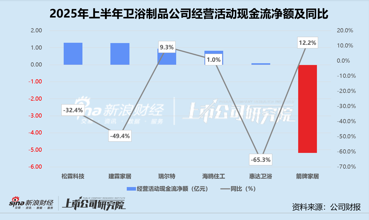 就盈利质量而言,报告期内只有箭牌家居的经营活动现金流为净流出,松霖科技、建霖家居和惠达卫浴经营活动现金流净额均同比减少。松霖科技和建霖家居的经营活动现金流净额不分上下,规模都在1.30亿元左右,同比分别下降32.4%、49.3%。箭牌家居尽管收入名列前茅,现金流表现却不甚理想。细究其背后原因,主要是公司的保证金押金和利息收入近乎“腰斩”,结合合同负债期末余额低于期初余额的情况,箭牌家居或没有收到足够多的新订单和预付款,因此不得不消耗自身的现金储备维持运营,高营收只是“纸面富贵”。