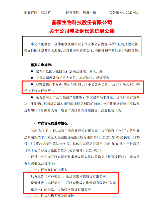 11月17日,基蛋生物发布涉诉公告。作为反诉原告,状告武汉众聚成咨询管理有限责任公司,第三人为武汉景川诊断技术股份有限公司。