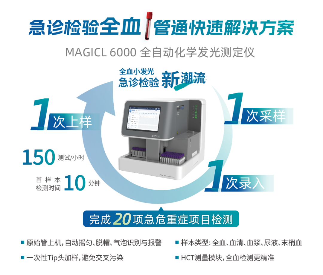 MAGICL 6000 全自动化学发光测定仪体积小测速快。仪器配备全血HCT模块保证全血检测精度;最高测速可达150 T/H,最快检测时间为10 min;全自动加样模块,降低人工操作可能带来的误差;一次性Tips头加样避免交叉污染。适用于中心实验室,门急诊检验,各临床科室等多种场合。