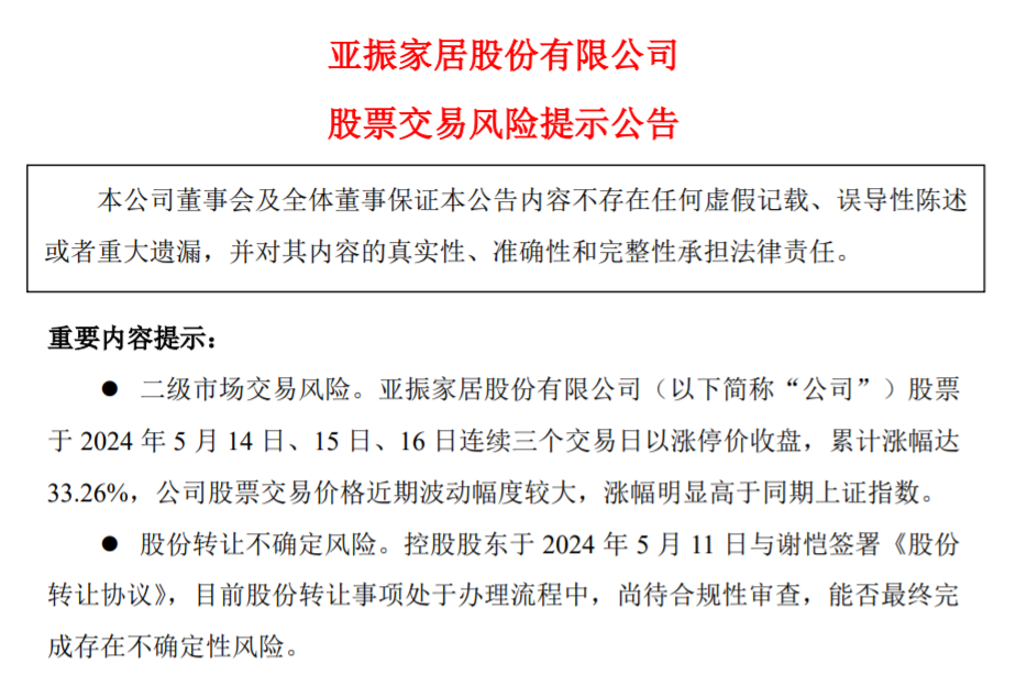 5月16日晚间,亚振家居发布股票交易风险提示公告表示,公司股票于2024年5月14日、15日、16日连续三个交易日以涨停价收盘,累计涨幅达 33.26%,股票交易价格近期波动幅度较大,涨幅明显高于同期上证指数。经自查,公司目前生产经营活动正常,主营业务未发生重大变化。