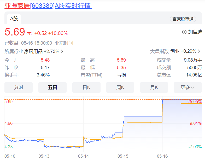 5月13日晚间的一则股份转让公告,让亚振家居(SH603389,股价5.69元,市值14.95亿元)的股价连续3个交易日封涨停板(5月14日-16日),累计涨幅达33.26%。