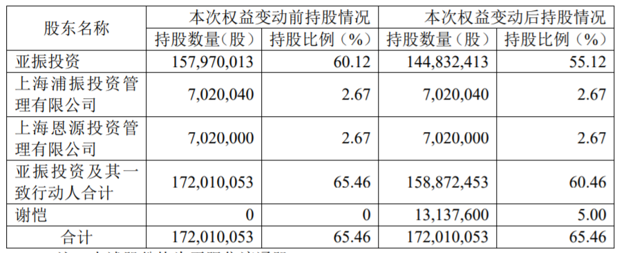 公告显示,本次权益变动后,亚振投资及其一致行动人合计持股比例为60.46%,上海浦振投资管理有限公司持股比例为2.67%,上海恩源投资管理有限公司持股比例为2.67%,谢恺持股比例为5%。