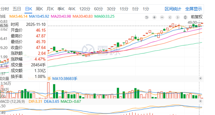截至11月10日收盘,公司股价报收47.64元/股,当日涨幅4.47%。该股在2025年4月8日盘中下探至4.45元/股后,一路震荡上行,于10月28日最高触及48.55元/股,区间涨幅高达9.91倍。
