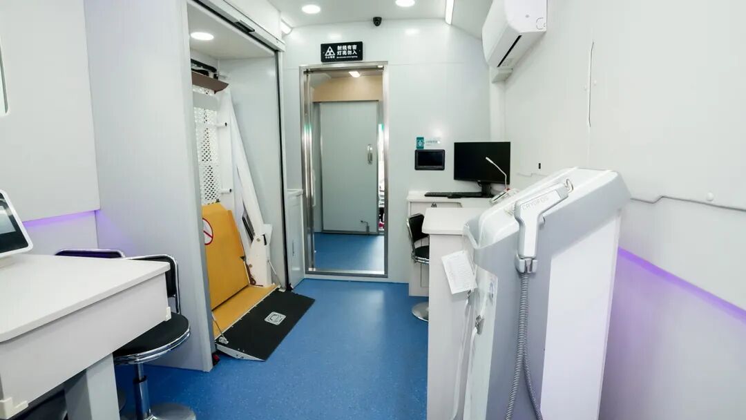 该智慧医疗车集成了五大核心功能模块:询诊区、DR检查室、体能检查区、治疗区及多功能检查室。其核心亮点在于搭载了高性能车载DR系统,并采用全密闭电磁屏蔽与全包围铅板设计,确保辐射安全完全符合严苛的车载医疗标准,可在移动环境中实现快速、清晰的影像学检查。