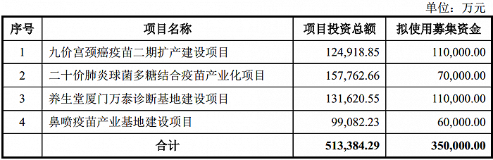 定增预案显示,该公司此次募资用于九价宫颈癌疫苗二期扩产建设项目(拟使用募资11亿元,下同)、二十价肺炎球菌多糖结合疫苗产业化项目(7亿元)、养生堂厦门万泰诊断基地建设项目(11亿元)、鼻喷疫苗产业基地建设项目(6亿元)。