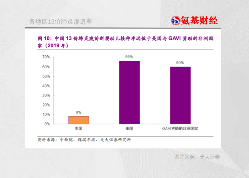 与居高不下的感染人数对应的是较低的疫苗渗透率。根据光大证券数据,2019年我国13价肺炎疫苗的渗透率仅8%。而美国这一数据高达66%,在GAVI(全球疫苗免疫联盟)资助的非洲国家,这一数据在50-70%。
