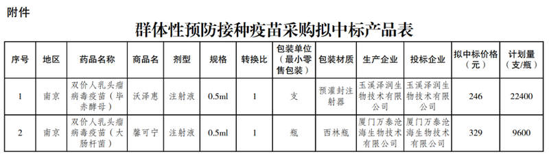 消息面上,近日南京市二价HPV政府采购结果公布,刚在3月获批的沃森生物以246元/支拟中标价格中标2.24万支的量,万泰生物则以329元/支拟中标价格中标0.96万支的量。