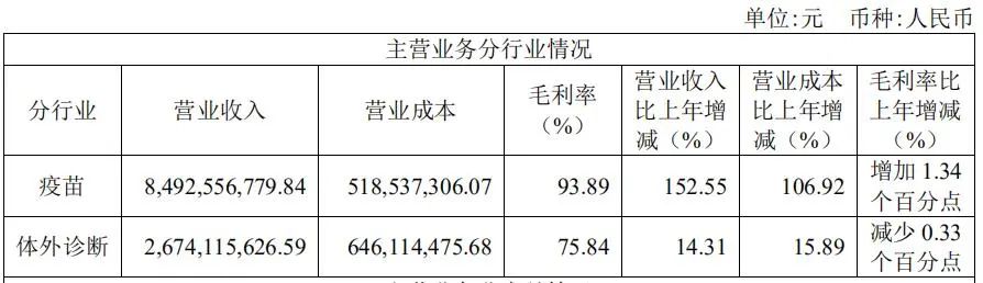 财报显示,2022年万泰生物疫苗板块实现营收84.93亿元,同比增长152.55%,营收占比为75.93%;体外诊断板块实现营收26.74亿元,同比增长14.31%,营收占比为23.91%。