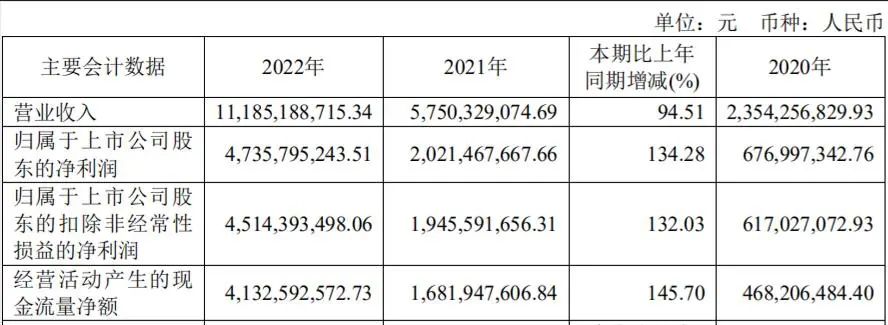 2023年3月20日,万泰生物发布2022年财报,全年实现营业收入111.85亿元,同比增长94.51%;实现归母净利润47.36亿元,同比增长134.28%。