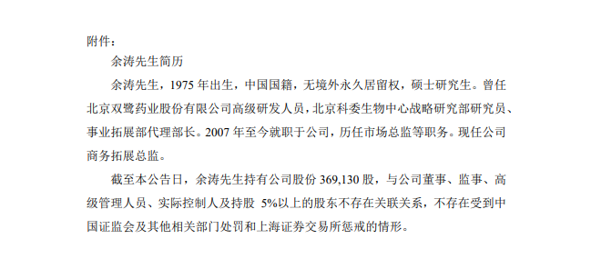 余涛先生,1975年出生,中国国籍,无境外永久居留权,硕士研究生。曾任北京双鹭药业股份有限公司高级研发人员,北京科委生物中心战略研究部研究员、事业拓展部代理部长。2007年至今就职于公司,历任市场总监等职务。现任公司商务拓展总监。截至本公告日,余涛先生持有公司股份369,130股,与公司董事、监事、高级管理人员、实际控制人及持股5%以上的股东不存在关联关系,不存在受到中国证监会及其他相关部门处罚和上海证券交易所惩戒的情形。