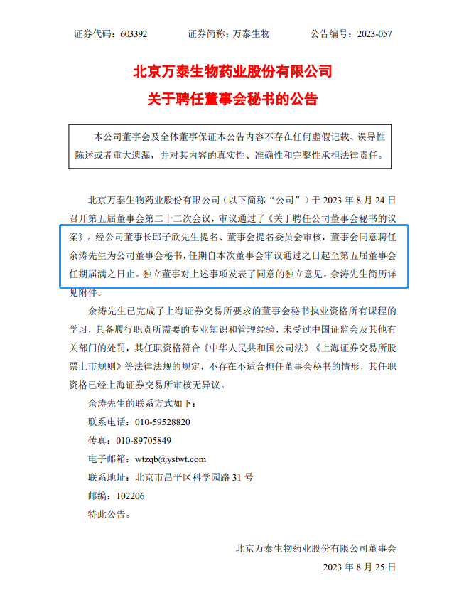 万泰生物(SH 603392,收盘价:55.76元)8月25日发布公告称,经公司董事长邱子欣先生提名、董事会提名委员会审核,董事会同意聘任余涛先生为公司董事会秘书。