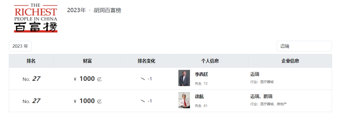 此次《2023年胡润百富榜》,在前100名当中,迈瑞医疗的徐航以及李西廷均以1000亿元的财富排名第27位。