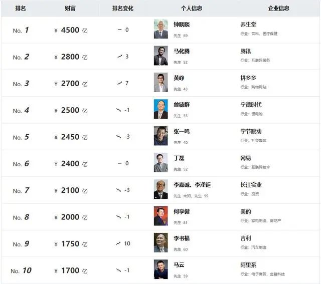 去年位列二、三名的字节跳动张一鸣和宁德时代曾毓群财富排名均下降,分别位列第五、四位。