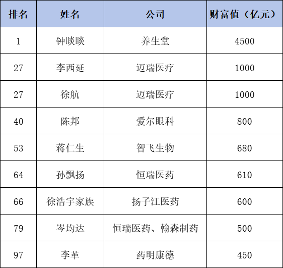除了钟睒睒,医药行业方面,迈瑞医疗李西延、徐航,爱尔眼科陈邦,智飞生物蒋仁生,恒瑞医药孙飘扬,扬子江医药徐浩宇家族,恒瑞医药、翰森制药岑均达,药明康德李革等也在此次胡润百富榜中。
