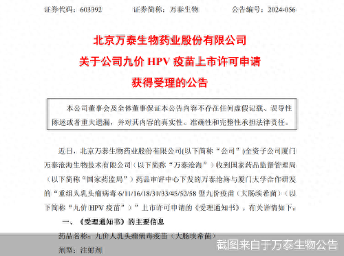 首款申报上市获受理的国产九价HPV疫苗花落万泰生物(603392)。