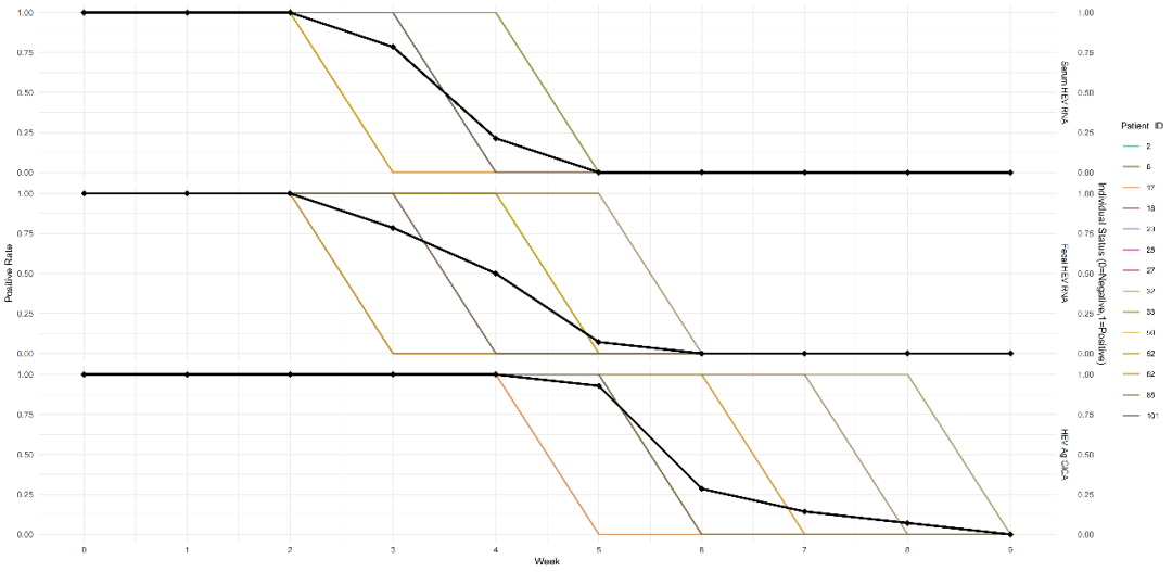 图1 展示了14名患者在随访进程中的阳性率曲线。横轴表示患者症状出现以来的周数,纵轴显示每个指标的阳性率。每从上到下的指标分别为:血清HEV RNA检测、粪便HEV RNA检测和尿液抗原检测。