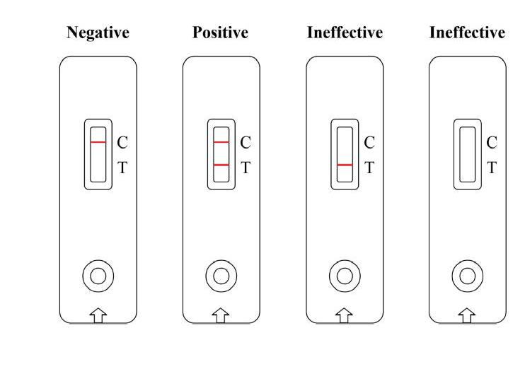 图2 万泰生物戊肝抗原尿液检测试剂检测结果的判读(从左到右依次判读为:阴性,阳性,不确定和不确定)